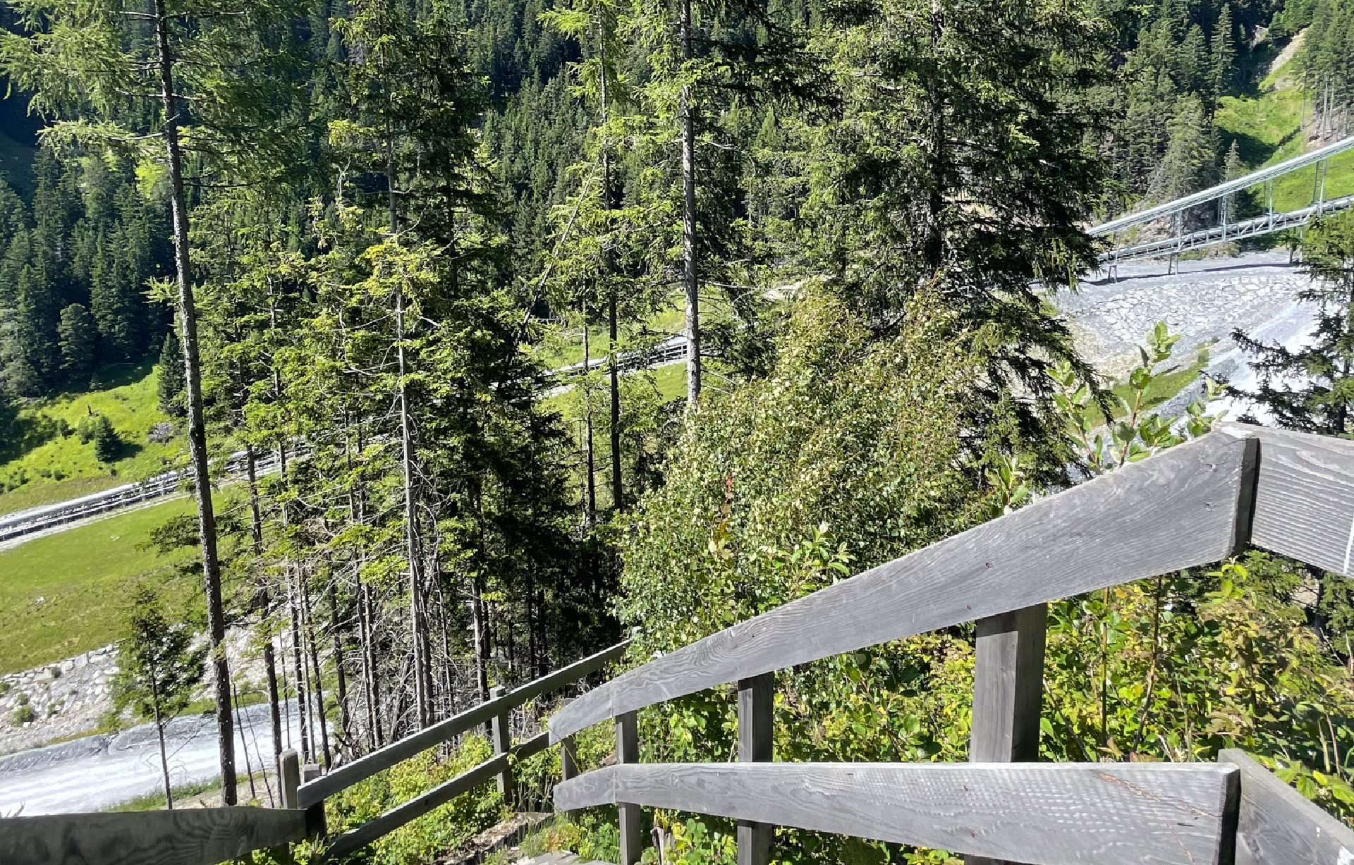 Follow the water pipe path on the sunny north side of the valley to the tunnel portal. Walk through the illuminated tunnel. At the exit portal, cross the Padaster brook and return to the entrance to the valley on the other side via the forest path and the new walking path with steps and a bridge.